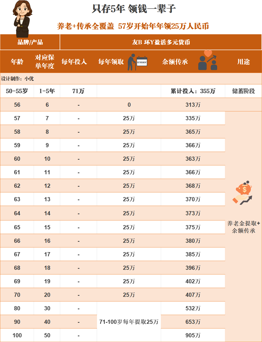 那天,一位客户笑着对我说: “小优,我终于明白什么叫——钱替我上班。” 她50岁出头,在一家外企做了二十多年财务,现在已经是财务总监。 薪水稳定,还有股票期权奖励,但她总觉得: “我辛苦一辈子,到底哪天才能不用靠工作过日子?” ——— 🧩 一场“退休焦虑”的对话 我问她:“你希望什么时候能不靠工作,也能安心花钱?” 她想了想,轻轻说: “最好55岁以后吧,不想靠孩子,也不想靠社保。” 于是我们一起算了一笔账👇 如果她用5年时间,每年规划50~70万, 从第7年开始—— 她就能每年稳定领取近20-30万现金流, 一直领到100岁都没问题。 我打趣说:“这不就是提前退休,还带年薪嘛!” 她笑了:“对啊,这感觉,比升职加薪还爽。” ——— 💡 她后来怎么说的 “我不是要暴富,我只是想要确定感。 就算不工作,钱也能安稳地流回来。 而且还能留给下一代,不用他们替我操心。” 听到这句话的时候,我其实挺感动的。 因为那一刻,她不是在谈投资—— 她是在谈生活的安全感。 于是有了以下的方案: ——— 🧭 写在最后 每个人都会老,但不是每个人都能老得安心。 早点规划现金流,让钱替你上班, 你就能早点拿回——时间的自由权。 “钱,是最听话的员工; 你越早雇用它,它就越会替你加班。” ——— 📞 想了解属于你的“终身现金流计划”? 留言或私信「现金流」,我帮你测算一份属于你的人生下半场方案。