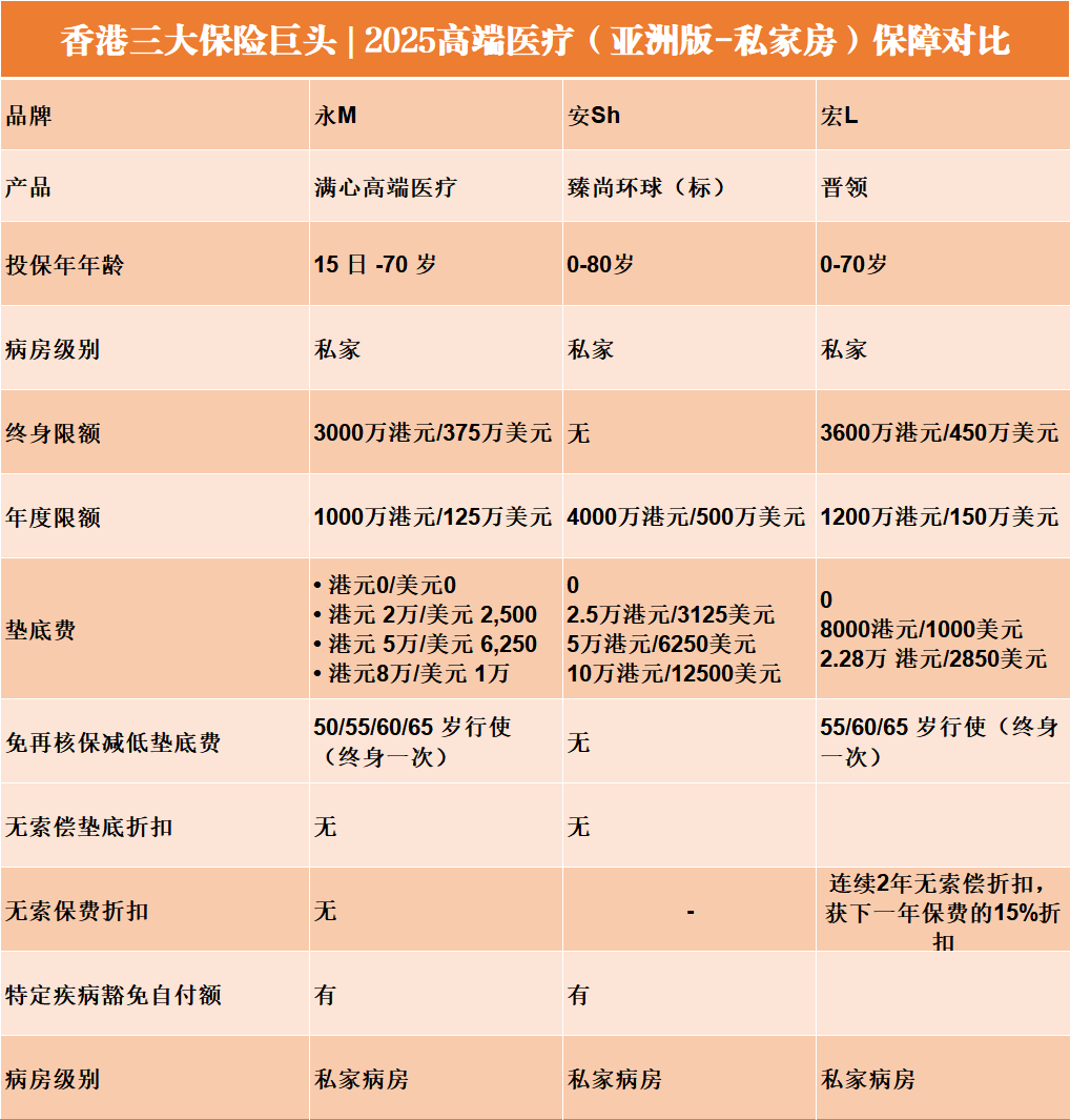 香港高端医疗险三强对比|永M・安Sh・宏L (亚洲|私家病房)方案