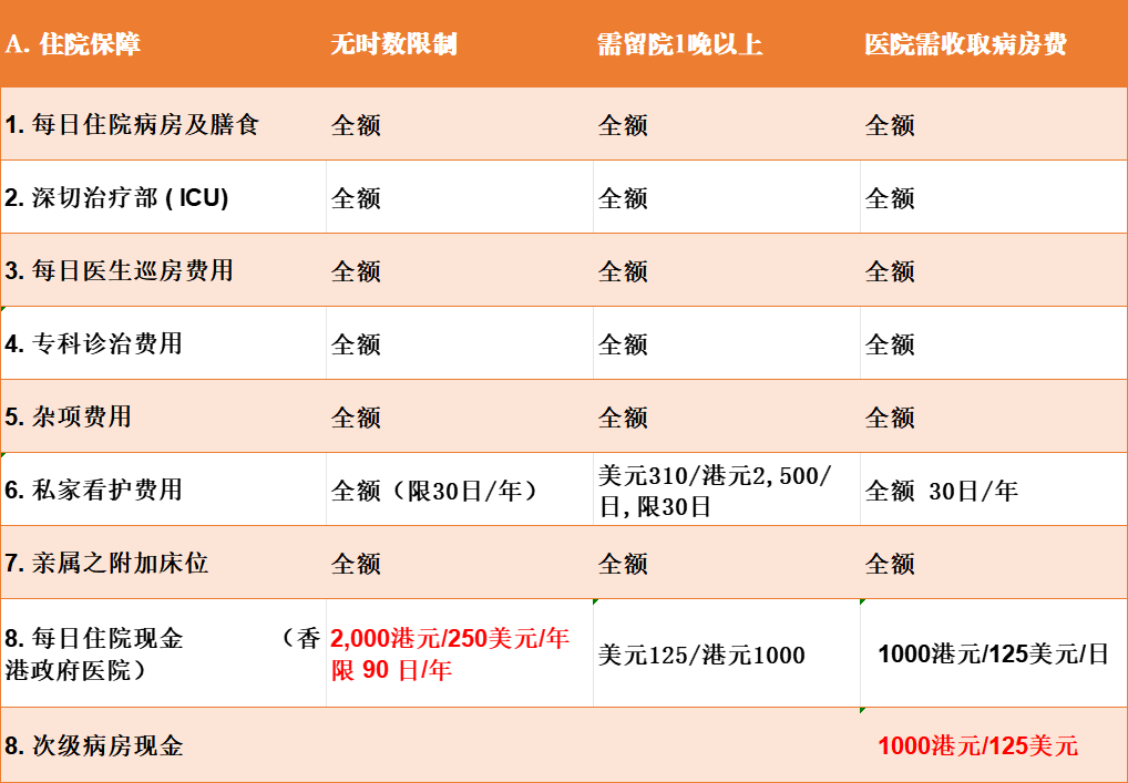 - 住政府医院住院补贴:永M为2000港币/天,安Sh与宏L为1000港币/天。