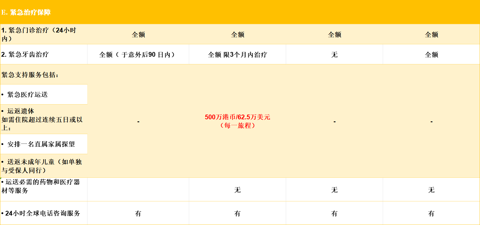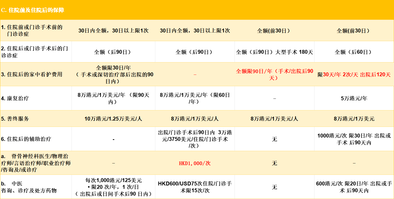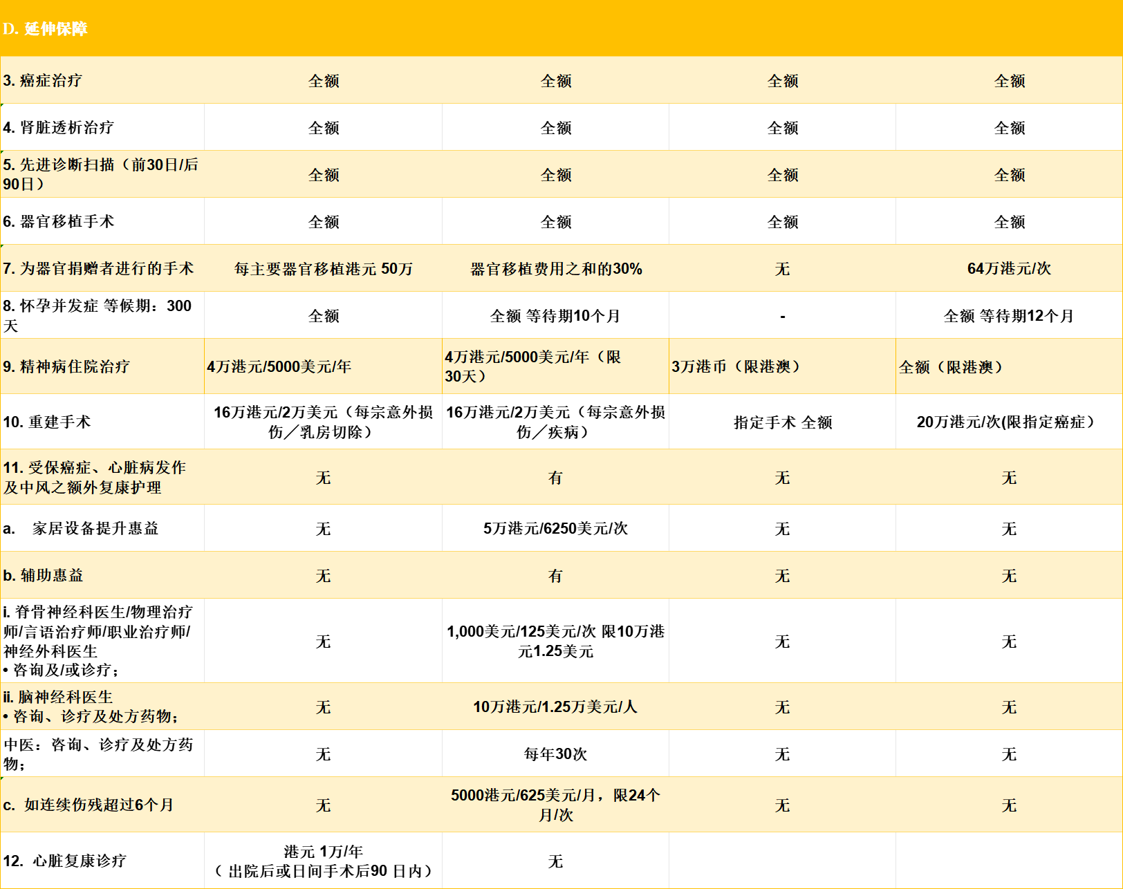 🔹 精神病住院治疗:宏L提供全额报销,其余是限额,均限香港境内