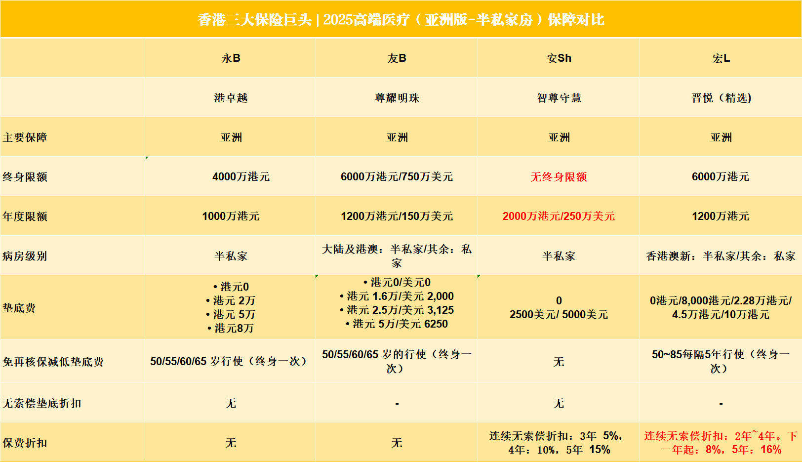 💡 保额方面:安SH没有终身限额,宏L与友B终身保额高达6000万港币。永M虽为4000万港币,但足以覆盖99.5%以上个案。