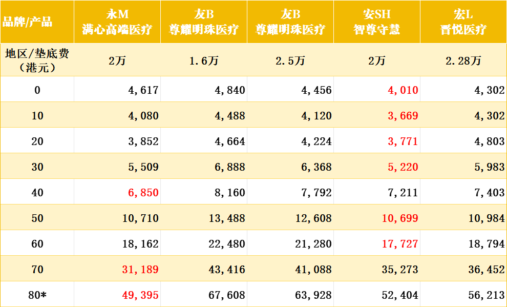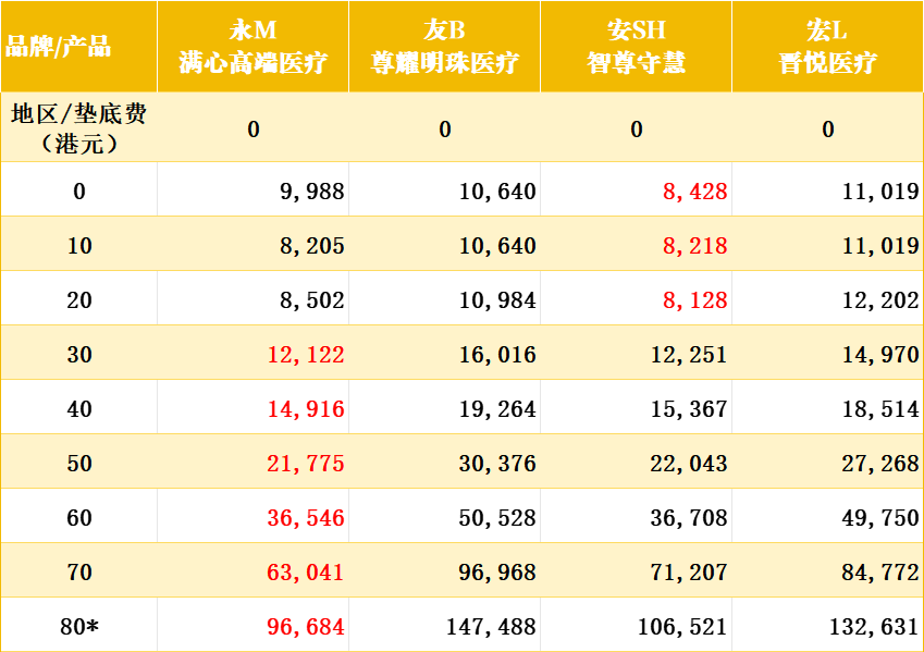 📌 无垫底费版本:前20年安SH占优,20岁后永M保费更具优势,友B最高。