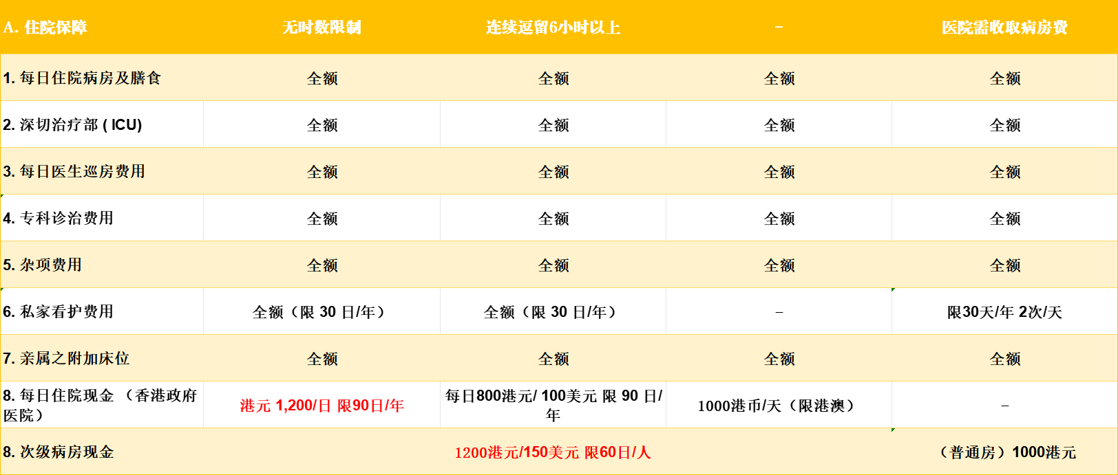 ✅ 次等病房补贴:友B1200港币/天,宏L1000港币/天,永M和安SH未提供